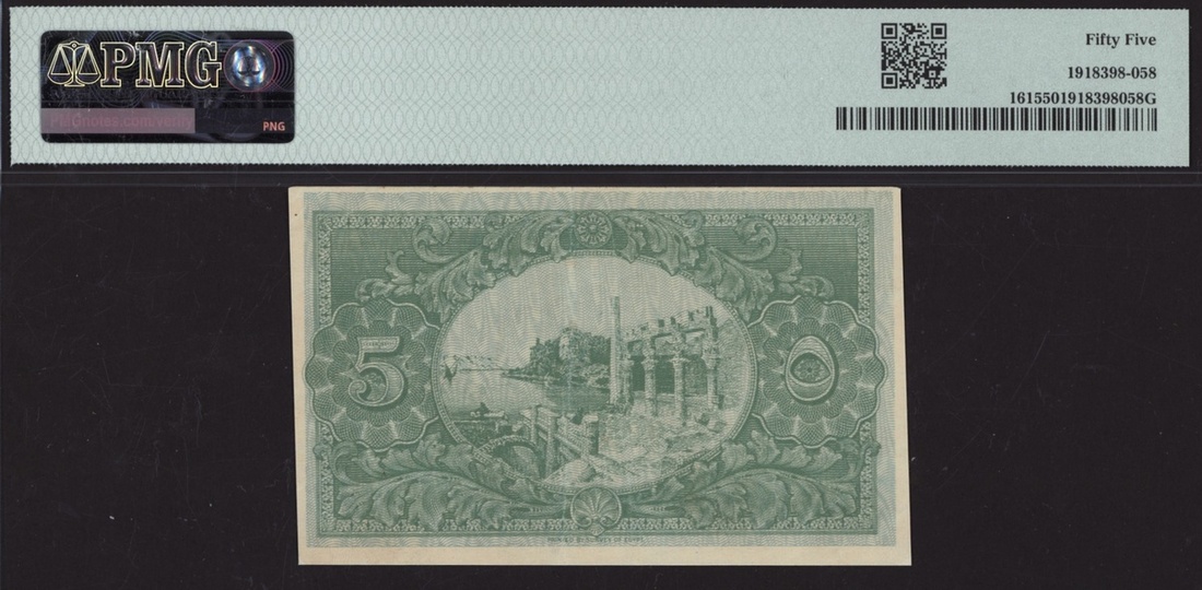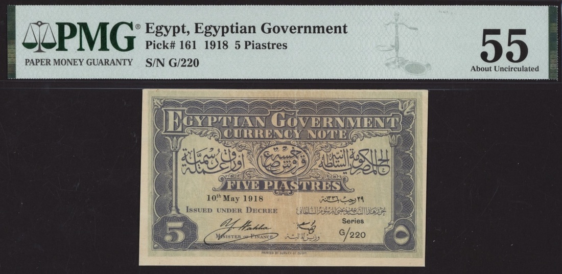 (x) Egyptian Government, 5 Piastres, 10th May 1918, series G/220, (Pick 161, BNB 203b2), in PMG holder 55 About Uncirculated