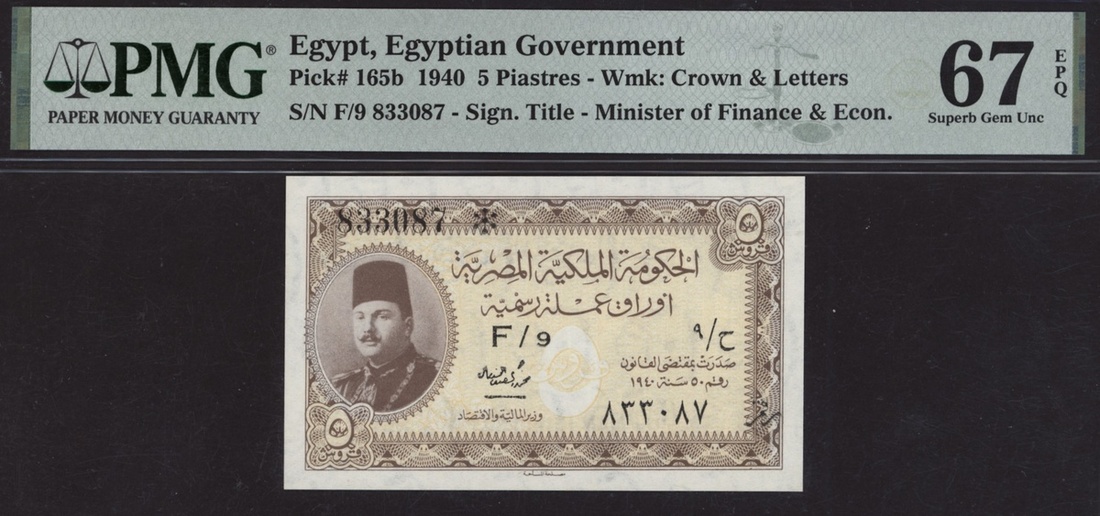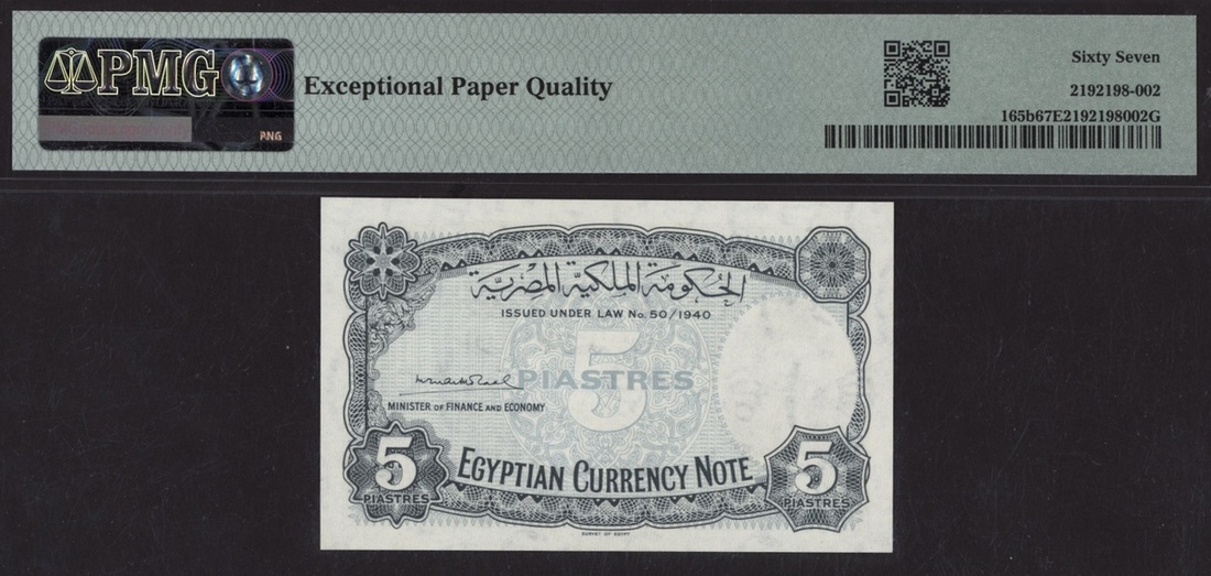 (x) Egyptian Government, [Top Pop] 5 Piastres, 1940, serial number F/9 833087, (Pick 165b, BNB 212a), in PMG holder 67 EPQ Superb Gem Uncirculated