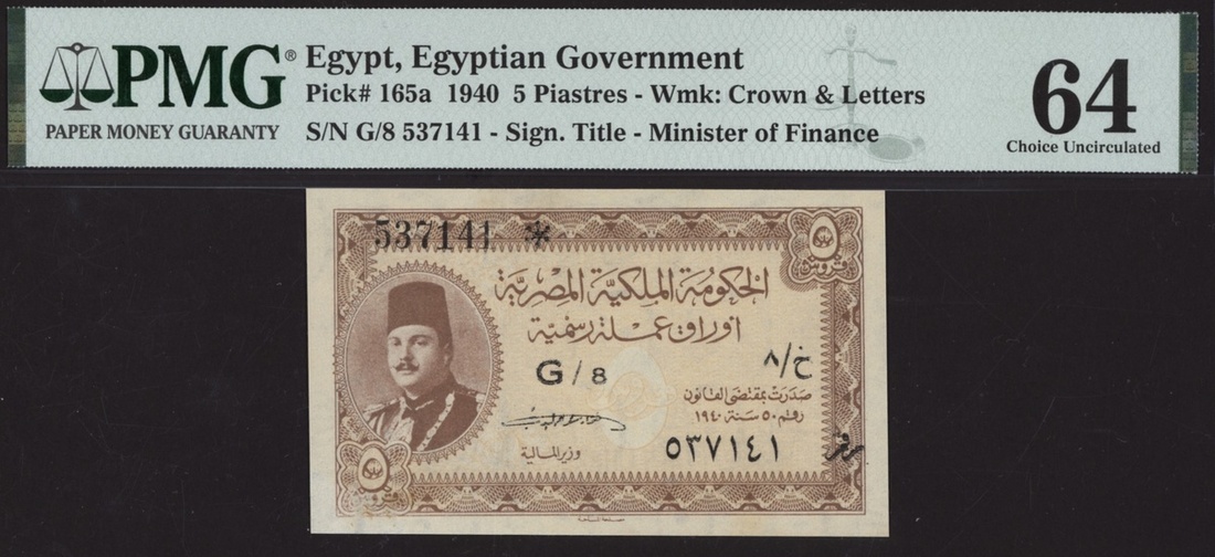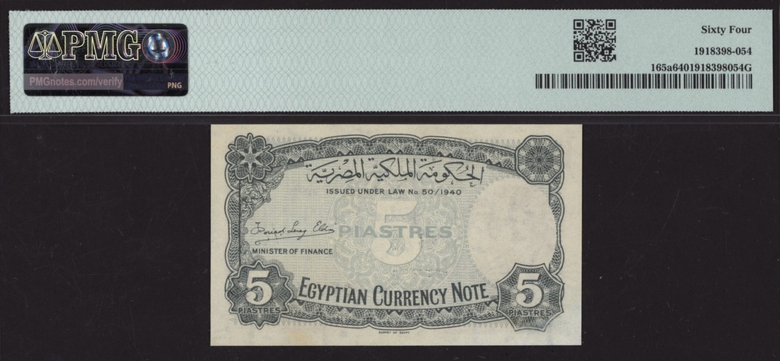(x) Egyptian Government, 5 Piastres, 1940, serial number G/8 537141, (Pick 165a, BNB 212a), in PMG holder 64 Choice Uncirculated