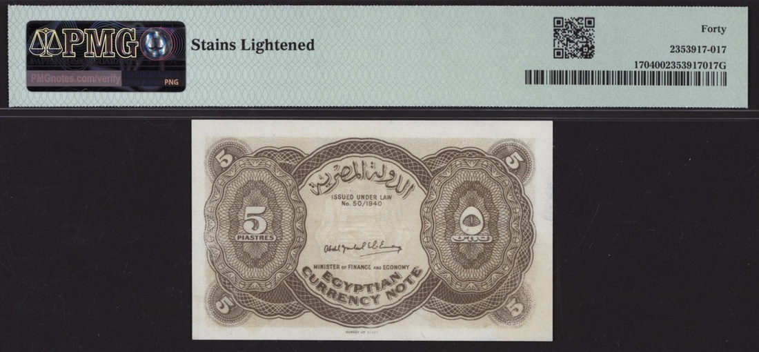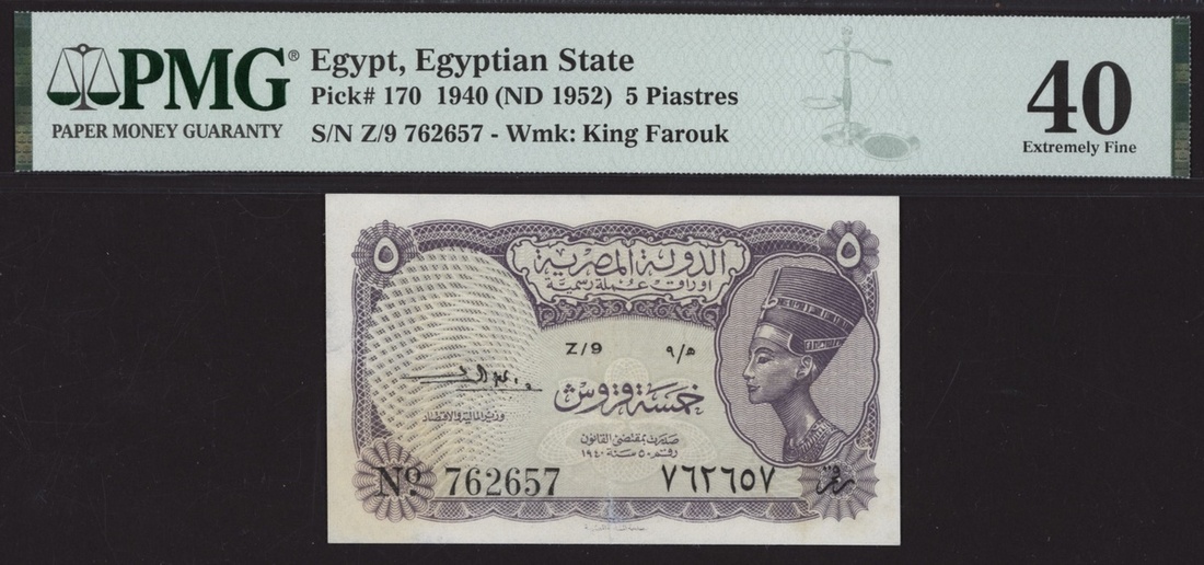 (x) Egyptian State, 5 Piastres, 1940 (ND 1952), serial number Z/9 762657, (Pick 170, BNB 216a), in PMG holder 40 Extremely Fine, stains lightened