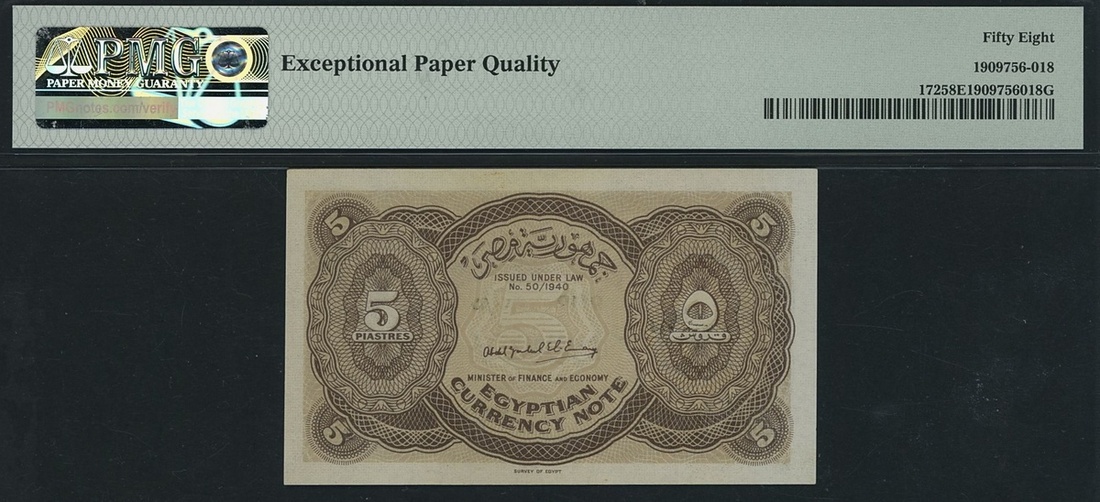 (x) Egyptian Republic, Egypt, 5 Piastres, 1940 (ND 1952), serial number D/10 231673, (Pick 172, BNB 218), in PMG holder 58 EPQ Choice About Uncirculated