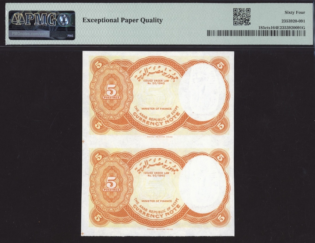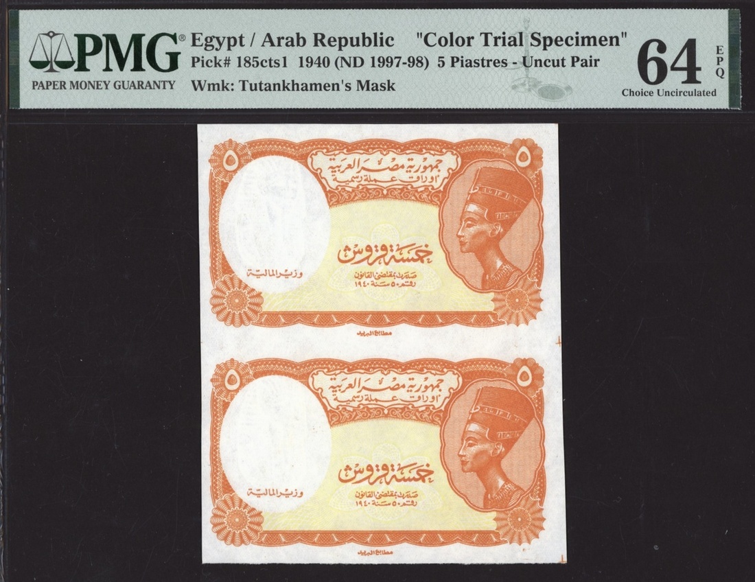(x) Arab Republic, Egypt, [Top Pop] colour trial specimen, uncut pair 5 Piastres, 1940 (ND 1997-1998), (Pick 185cts1, BNB 229 for the type), in PMG holder 64 EPQ Choice Uncirculated, single finest graded at PMG census