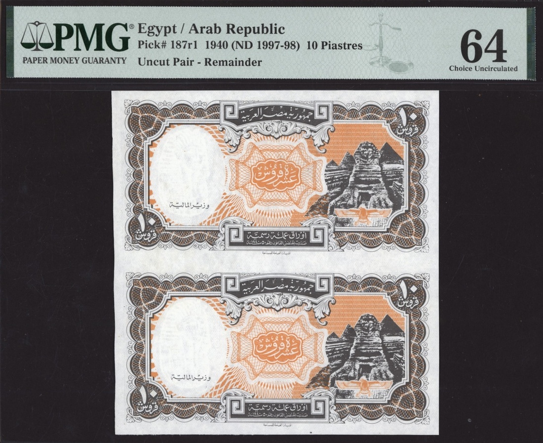 (x) Arab Republic, Egypt, remainder, uncut pair 10 Piastres, 1940 (ND 1997-1998), (Pick 187r1, BNB 230 for the type), in PMG holder 64 Choice Uncirculated, only 4 notes graded higher on PMG Census
