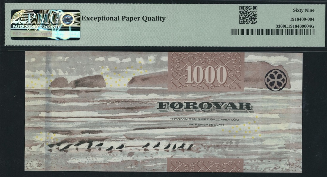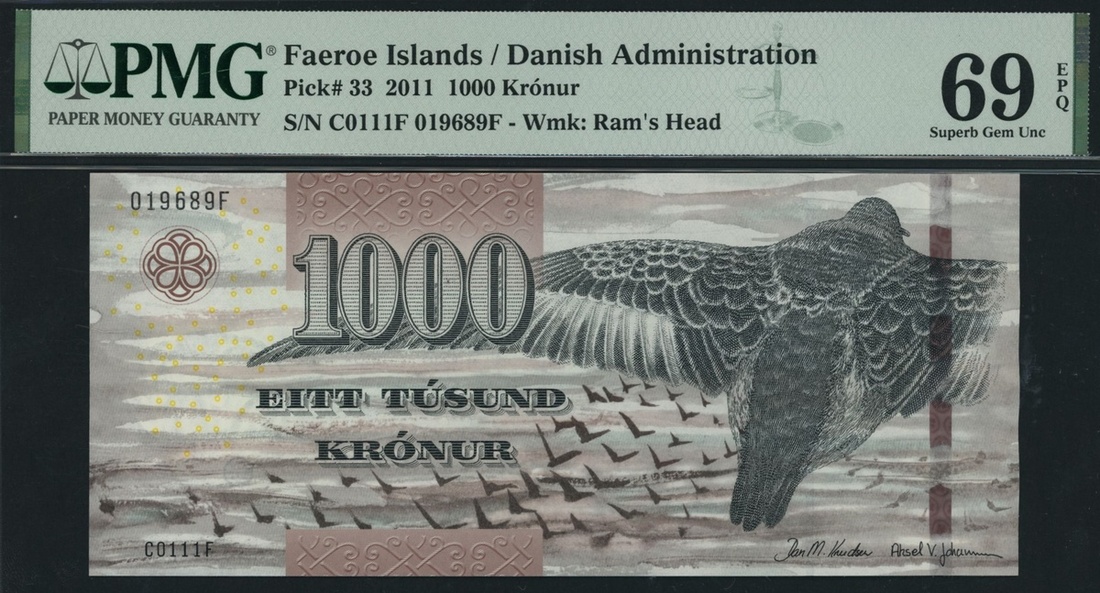 (x) Faeroe Islands (Danish Administration), 1000 Kronur, ND (2011), serial number C0111F 019689F, (Pick 33, BNB 221), in PMG holder 69 EPQ Superb Gem Uncirculated, very high grade!