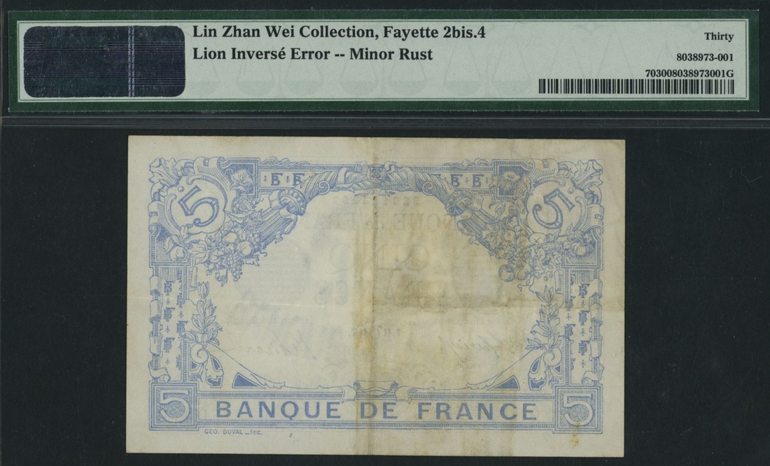 (x) Banque de France, error 5 Francs, 11th August 1916, serial number M.12806 202, blue, man standing at left, woman standing with staff at right