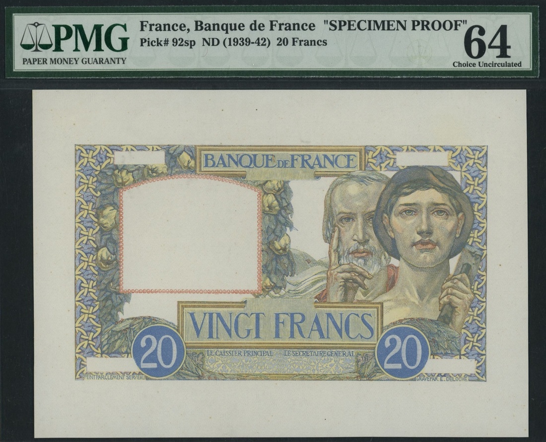 (x) Banque de France, uniface specimen proof 20 Francs, ND (1939-42), blue and multicolour, allegorical bust of a worker and a scientist at right, missing underprints, serial numbers and signatures