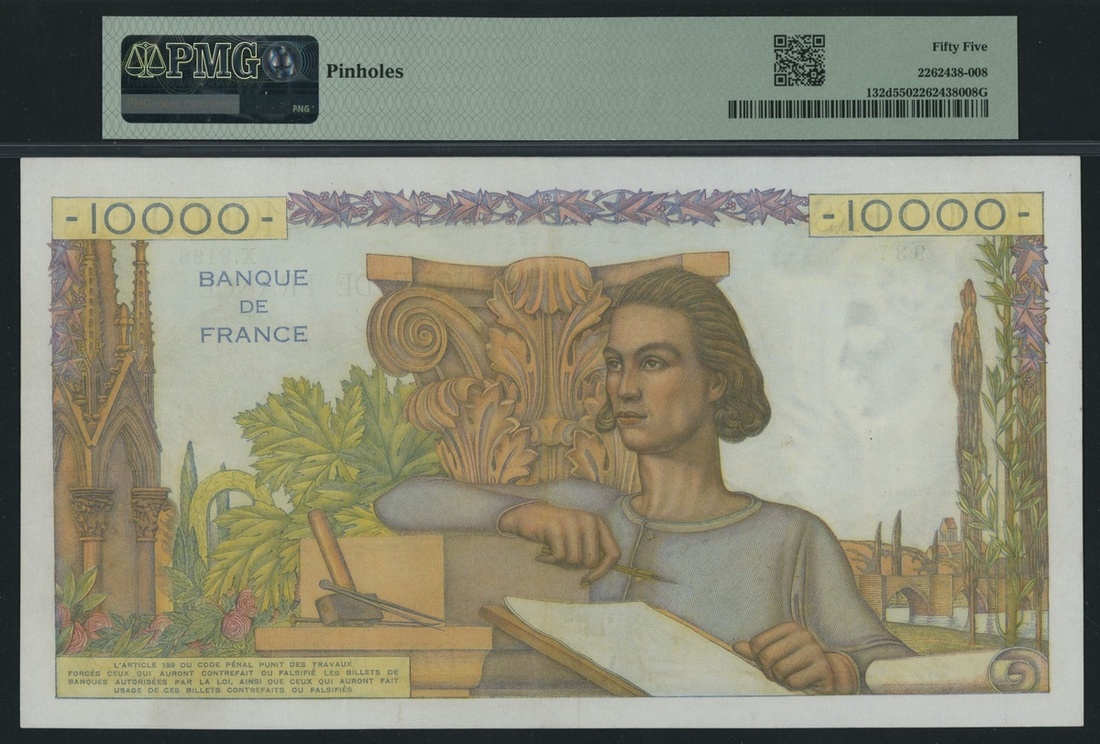 (x) Banque de France, 10000 Francs, 2 June 1955, serial number X.9198 937, (Pick 132d), in PMG holder 55 About Uncirculated, pinholes