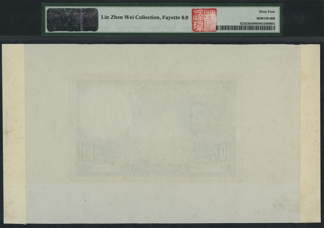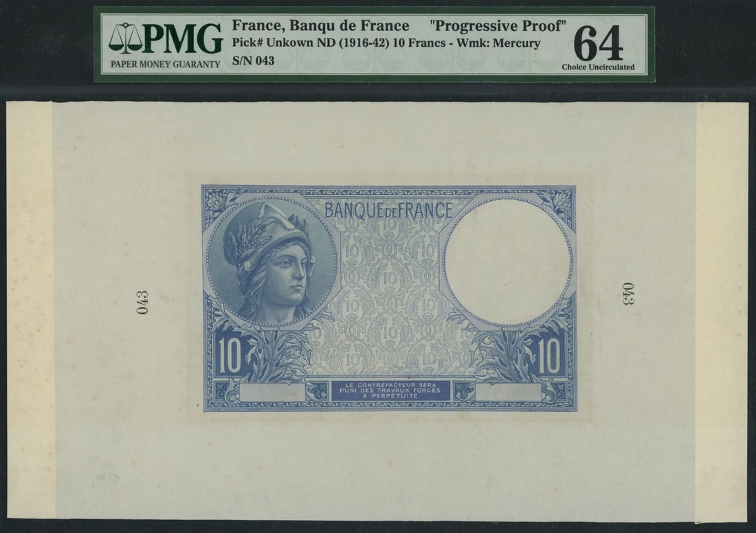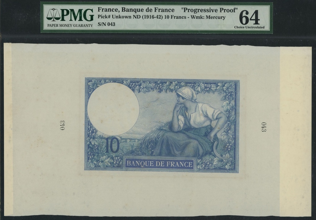 (x) Banque de France, [2 notes] uniface obverse and reverse progressive proof of 10 Francs, ND (1916-42), control number 43, blue, Athena at top left, values at two lower corners, reverse, woman sitting on haystack holding sickle, missing serial number and signatures