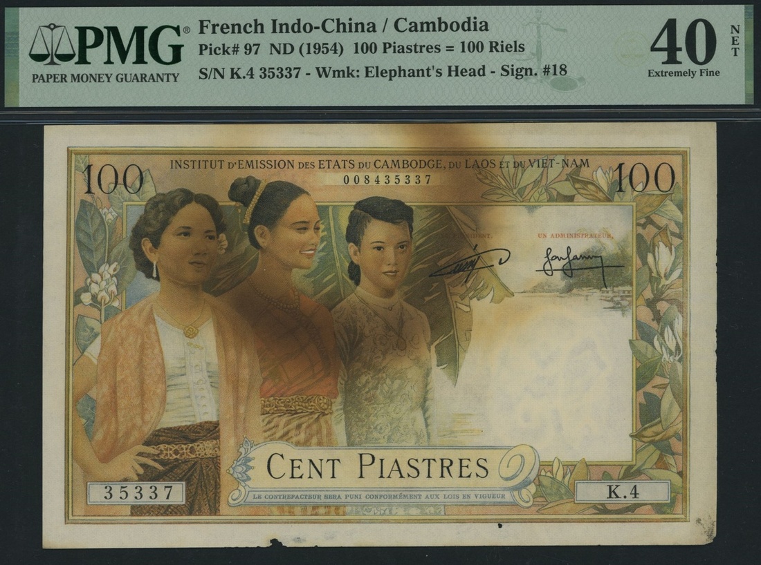 (x) French Indo-China, Cambodia, 100 Piastres, ND (1954), serial number K.4 35337, (Pick 97), in PMG holder 40 NET Extremely Fine, stained, minor edge damage