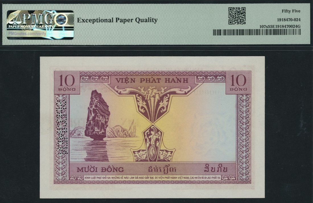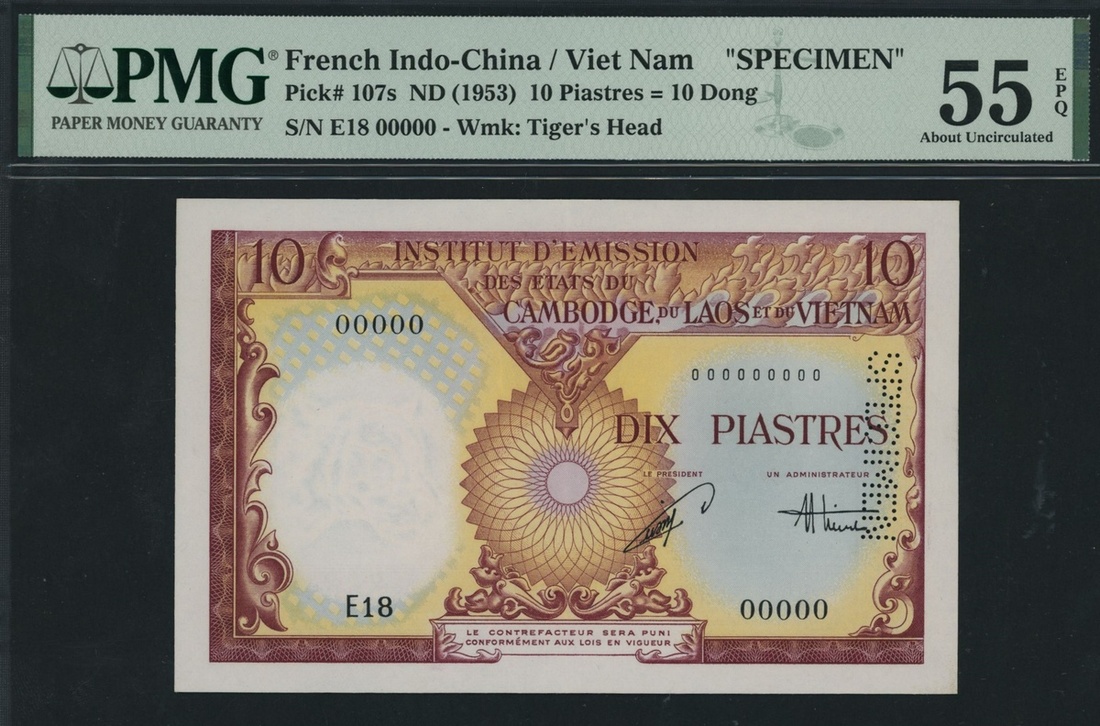 (x) Institut d'Emission des Etats du Cambodge du Laos et du Vietnam, specimen 10 Piastres, ND (1953), serial number E18 00000, (Pick 107s), in PMG holder 55 EPQ About Uncirculated