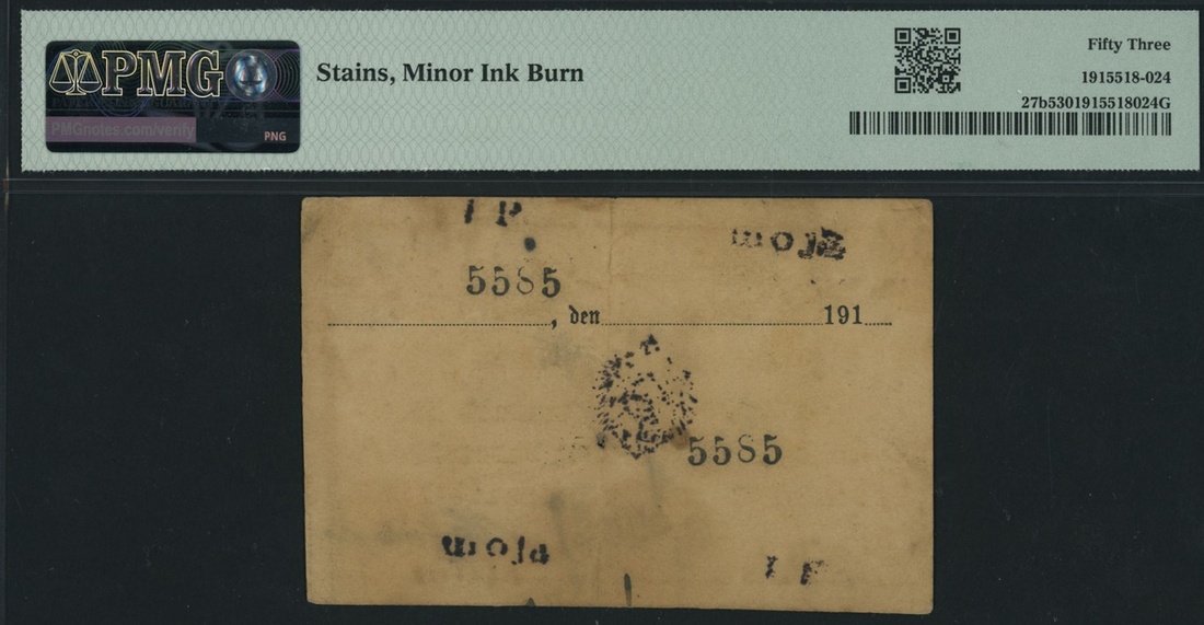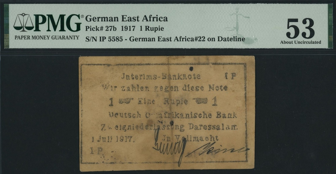 Deutsch-Ostafrikanische Bank, German East Africa, [Letterhead] 1 Rupie, 1917, serial number IP 5585, (Pick 27b), in PMG holder 53 About Uncirculated, stains, minor ink burn, with date line overprint, scarce