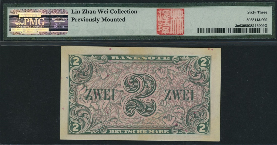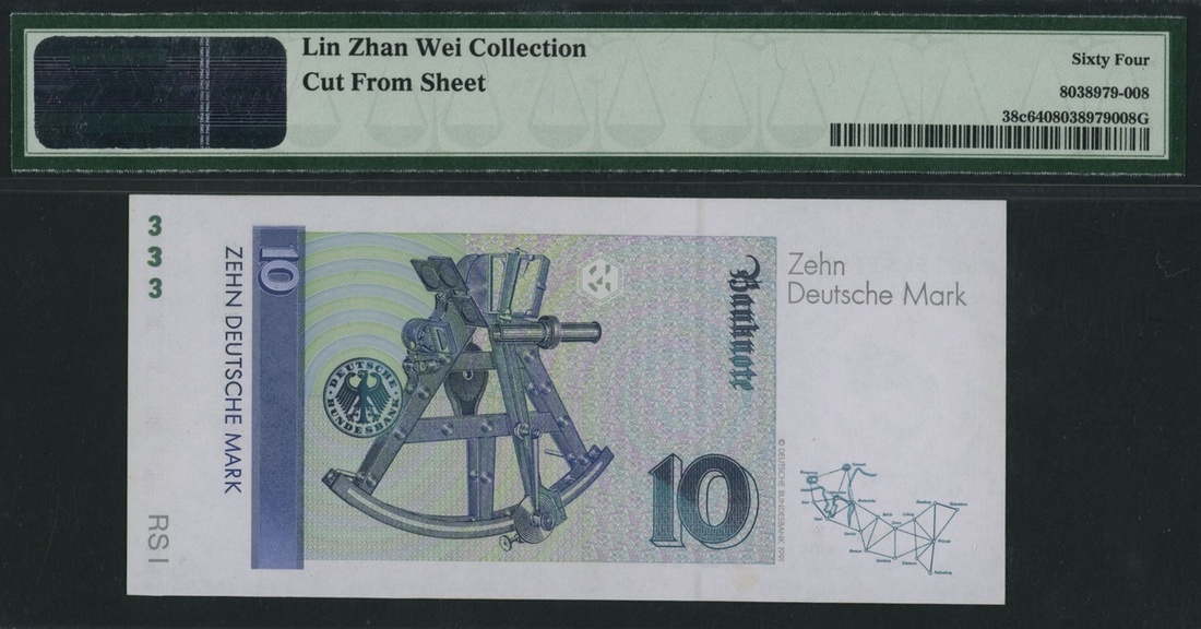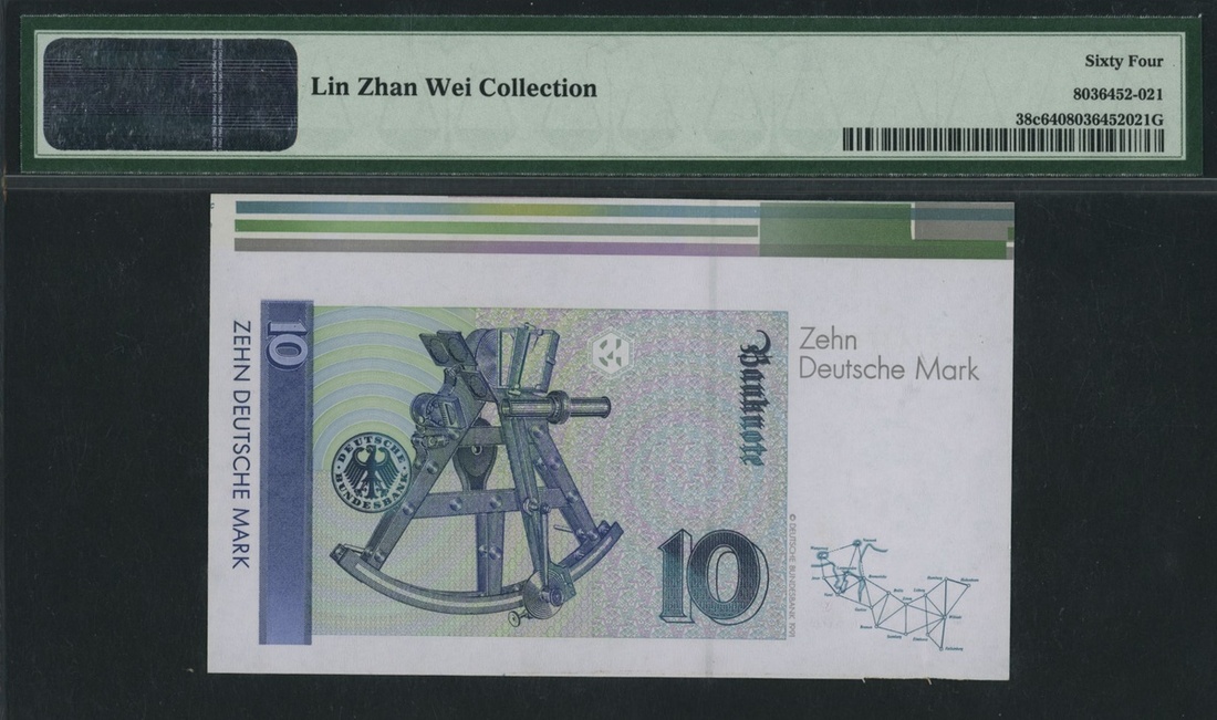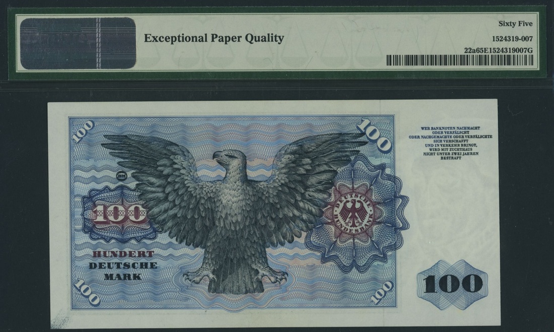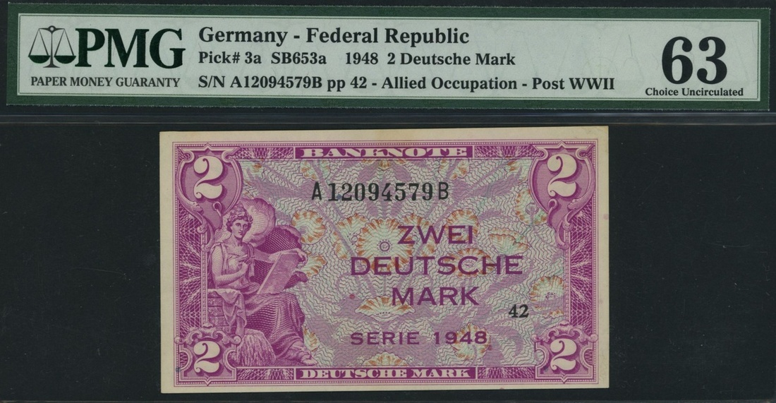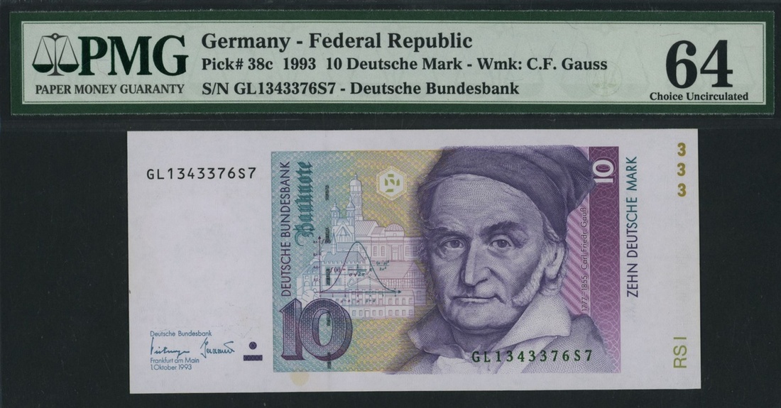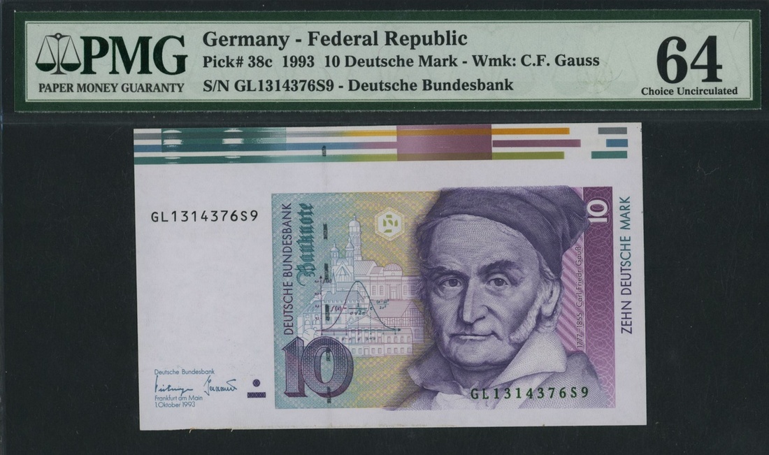(x) Germany, Federal Republic, [4 notes] 100 Deutsche Mark, 1960, serial number P1217377D, blue on multicolour underprint, Master Sebastian Münster by artist Christoph Amberger, at right, reverse eagle, 2 Deutsche Mark, 1948, serial number A12094579B, pink and green, seated allegorical woman (representing trade) with pen and tablet at left, 10 deutsche mark (2), 1993, serial number, GL1343376S7, GL1314376S9, purple, green and yellow, scientist Carl Friedrich Gauss at right, reverse. Heliotrope