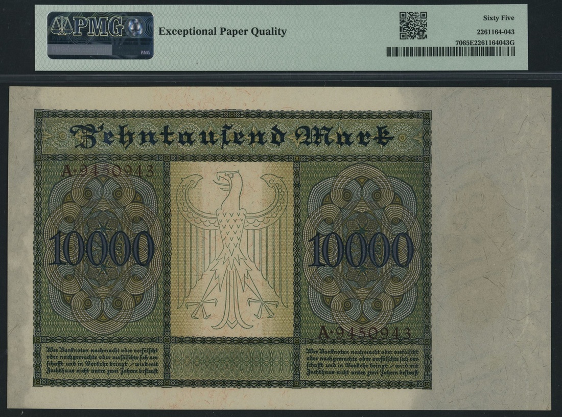 (x) Republic Treasury Note, Germany, 10000 Mark, Berlin, 19 January 1922, serial number A9450943, (Pick 70), in PMG holder 65 EPQ Gem Uncirculated