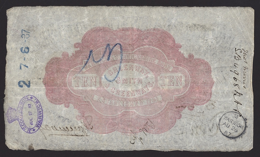 Warwick and Warwickshire Bank, £10, Warwick, 7th April 1886, serial number W5599, (Outing 2279f), good fine, pinholes