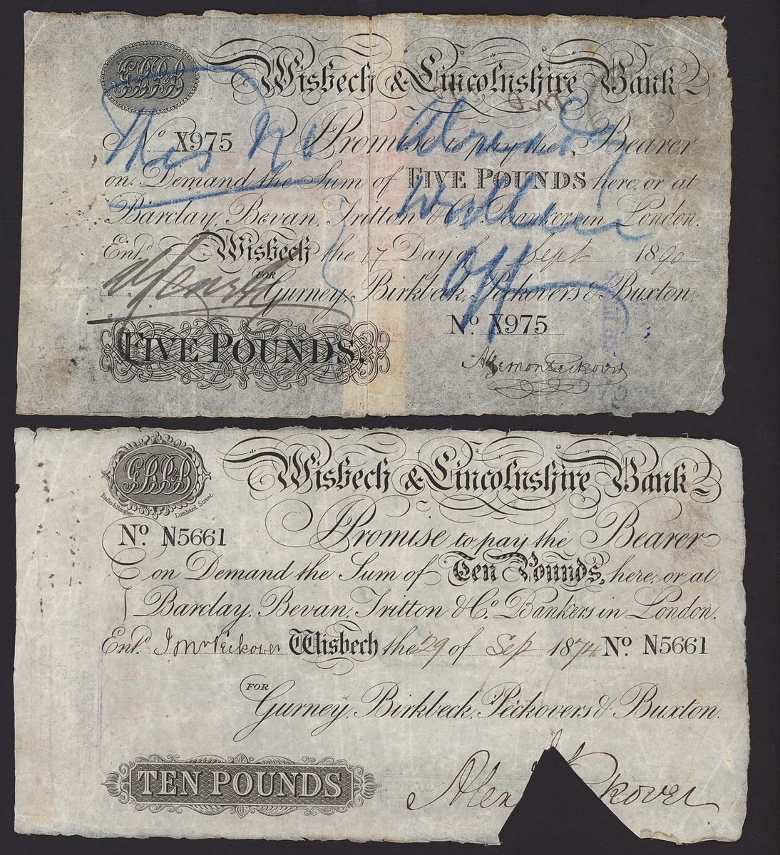 Wisbech and Lincolnshire Bank, [2 notes] £5, £10, 1874-90, £5, 17th September 1890, serial number X975;