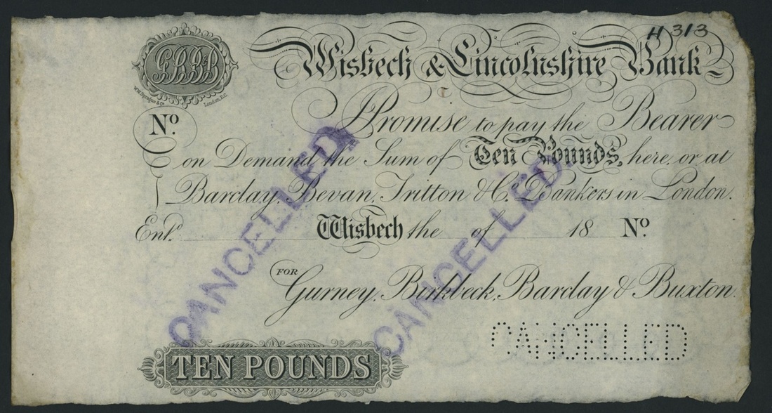 Wisbech & Lincolnshire Bank, cancelled unissued £10, Wisbech, 18xx (ND 1891-1896), for Gurney, Birkbeck, Barclay & Buxton, cancelled stamps and cancelled perforation