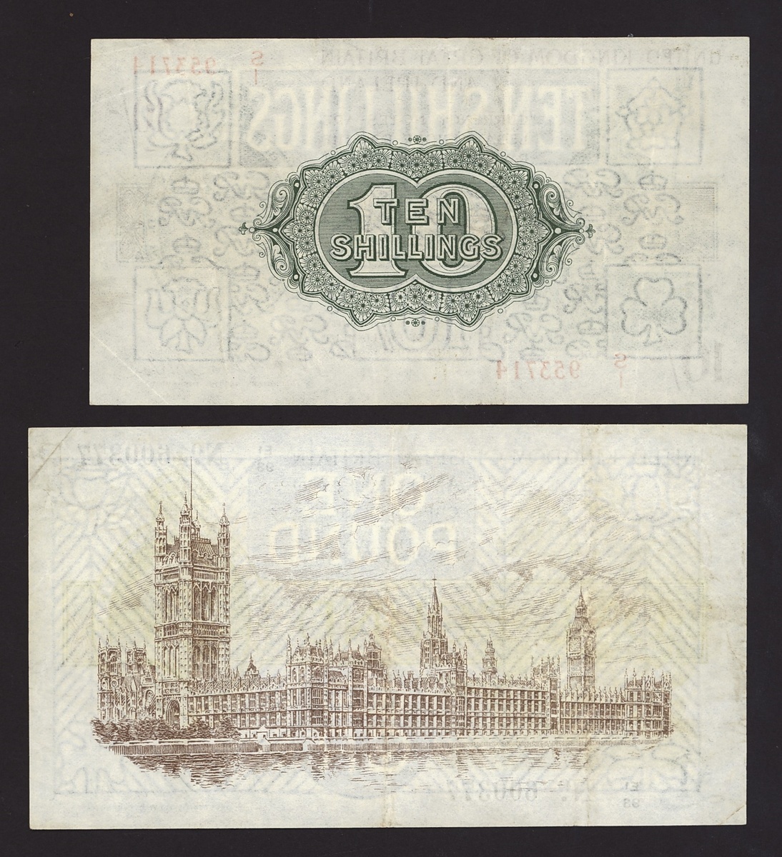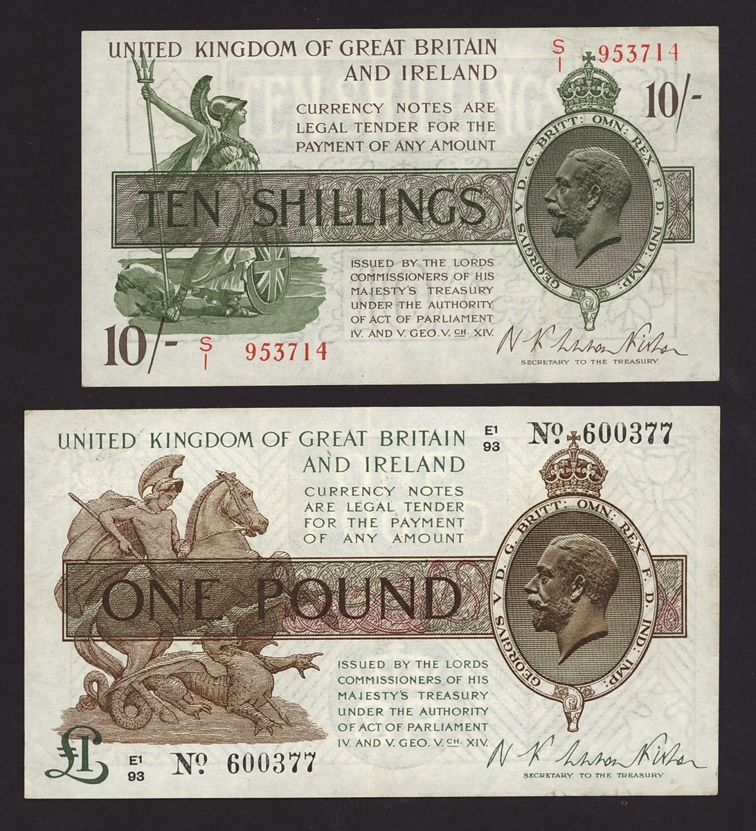 Treasury Note, N. F. W. Fisher, [2 notes] 10 Shillings, £1, 1922-23, [LAST SERIES] 10 Shillings, ND (1922), serial number S/1 953714;