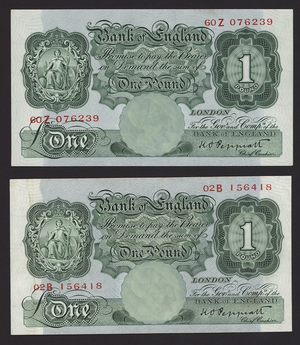 FIRST AND LAST SERIES NOTES, £1, ND (1934), serial numbers 02B 156418 and 60Z 376239, Peppiatt signature