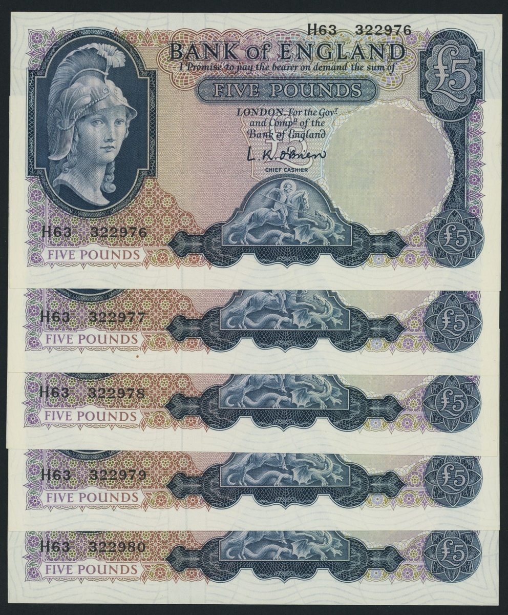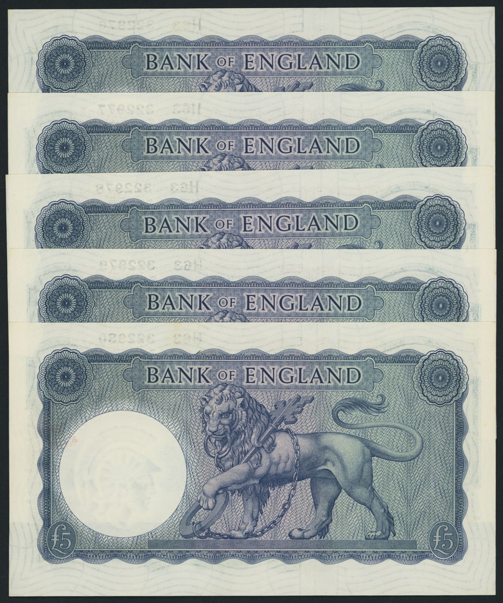 Bank of England, [5 notes] [FIRST SERIES] £5, ND (1961), consecutive serial numbers H63 322976-980, (EPM B 280), about uncirculated, pressed, some handling creases (5 notes)