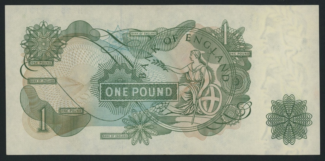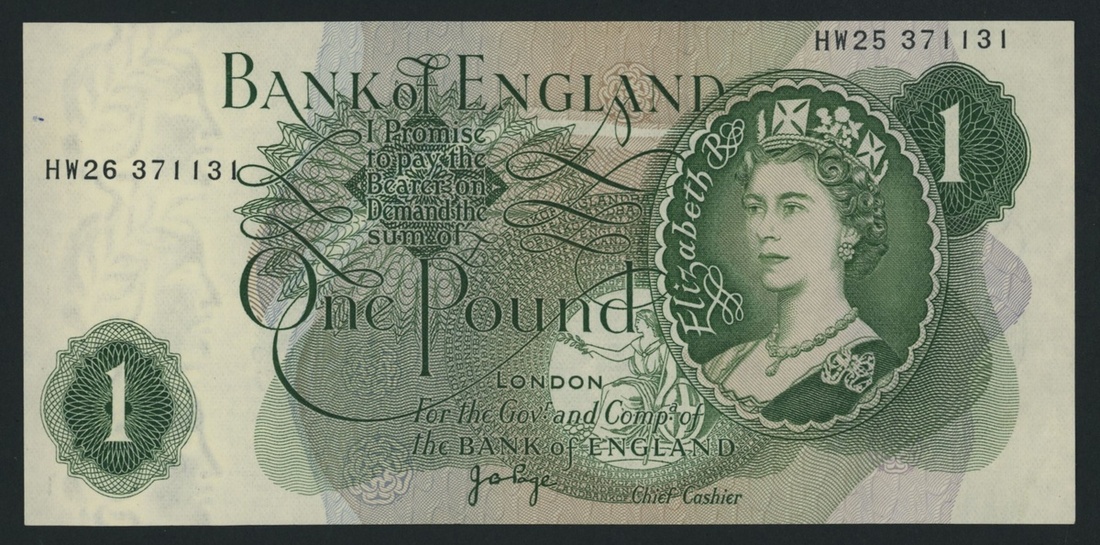 Bank of England, Error Note, £1, ND (1970), serial number error in placement and in having two difference prefixes: serial number HW26 371131 on the left and HW25 371131 on the right of the obverse