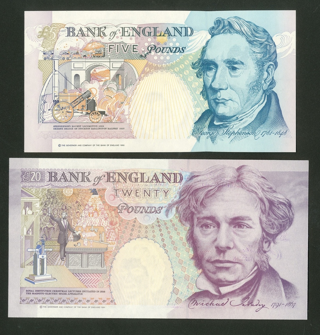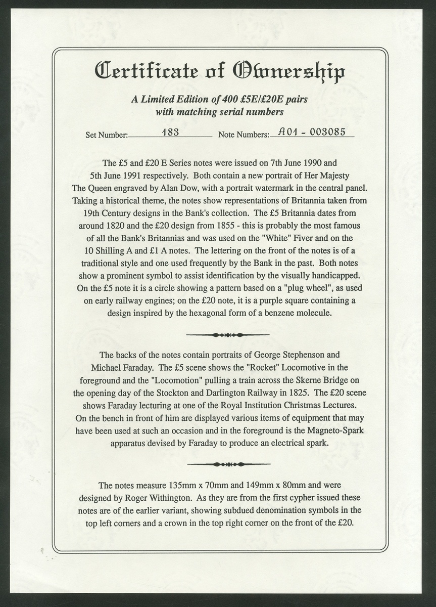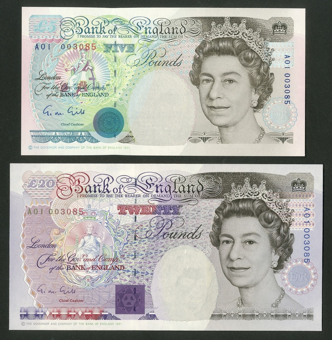 Bank of England, G. M. Gill, [2 notes] [FIRSTS] £5, £20, 1994, serial number A01 003085, including the original Certificate of Ownership on watermark paper