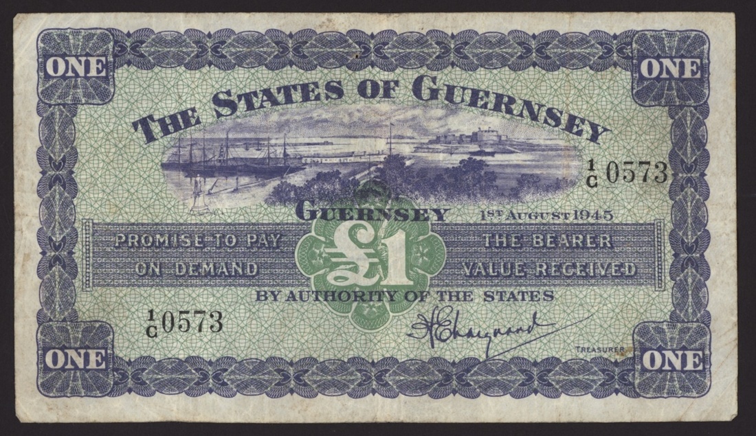 (x) The State of Guernsey, £1, 1st August 1945, serial number 1/C 0573, this note is the first date of the £1 issued post German occupation,