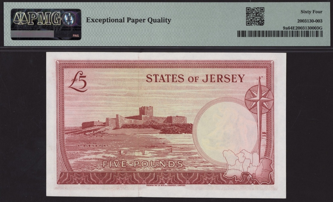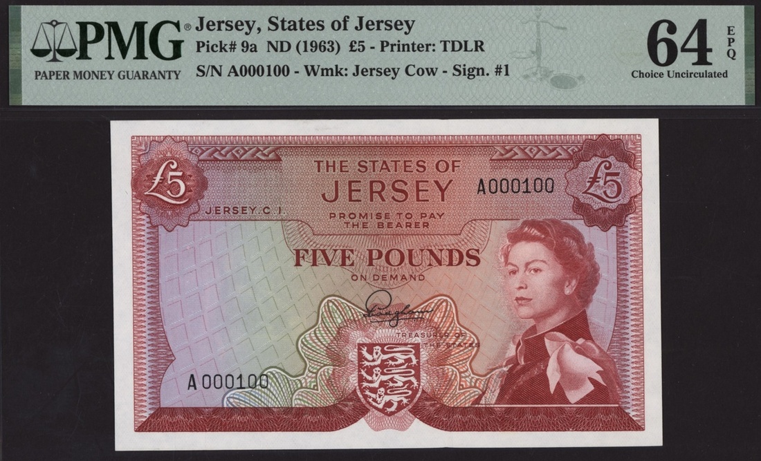 (x) States of Jersey, £5, ND (1963), serial number A000100, (Pick 9a, BNB 109), in PMG holder 64 EPQ Choice Uncirculated