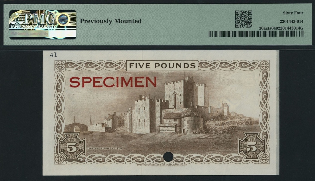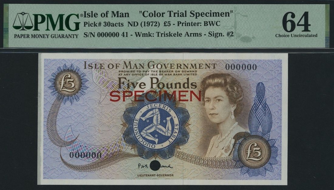 (x) Isle of Man Government, colour trial specimen £5, ND (1972), serial number 000000 41, (Pick 30acts, BNB 107 for the type), in PMG holder 64 Choice Uncirculated, only 1 note in higher grade on PMG Census