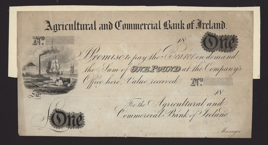 Agricultural and Commercial Bank of Ireland, proof £1, 18xx, no branch name, (PMI AG 4 for type, Proof unlisted), discolouration, some small nicks into border, partially mounted on card