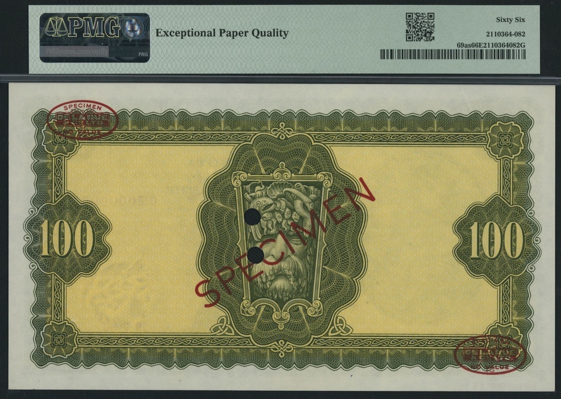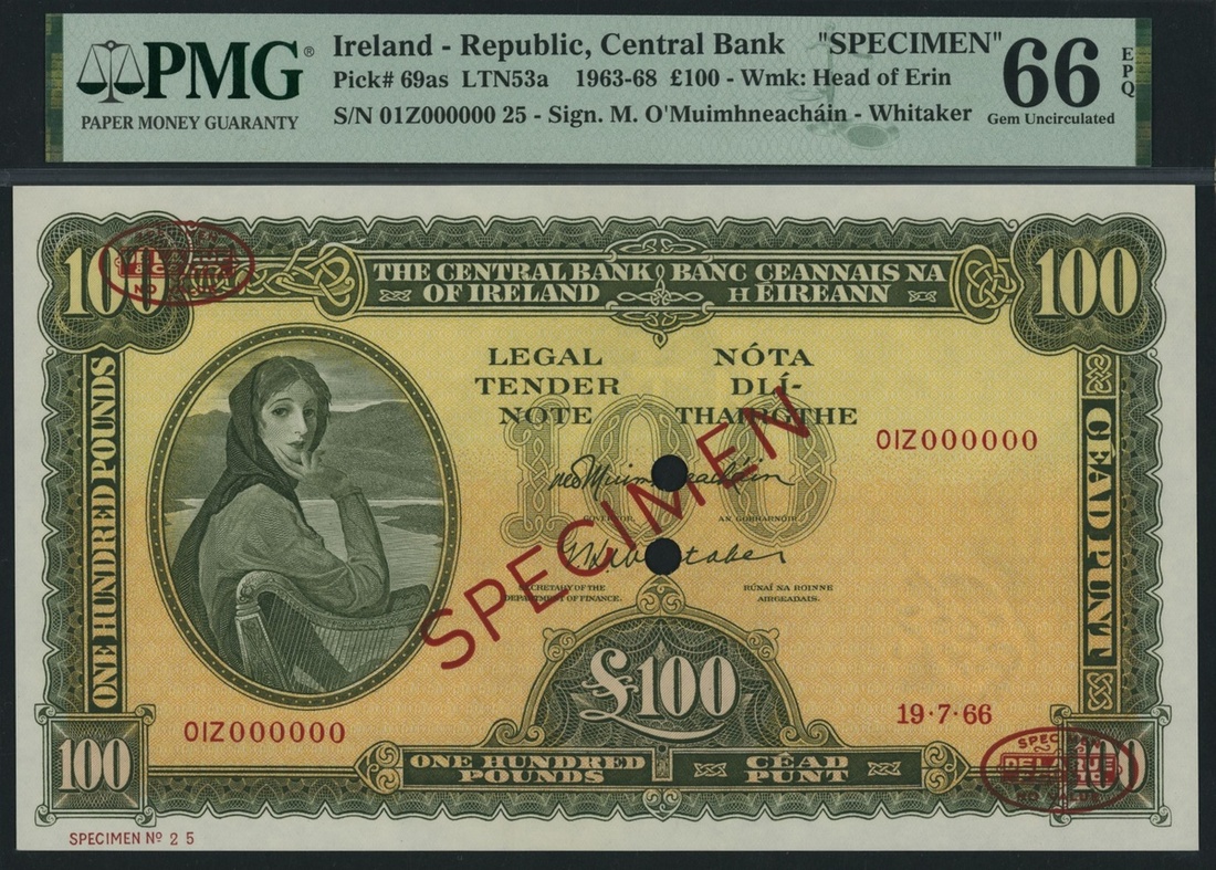 (x) Central Bank of Ireland, [Top Pop] specimen £100, 19th July 1966, serial number 01Z000000 25, (PMI LTN53a, Pick 69as, BNB 214as1), in PMG holder 66 EPQ Gem Uncirculated, tied for Finest graded on PMG Census