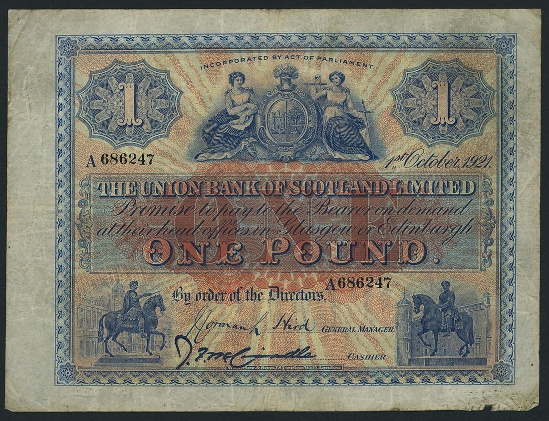 (x) Union Bank of Scotland, £1, Edinburgh, 1st October 1921, serial number A686247, (PMS UB 62), fine