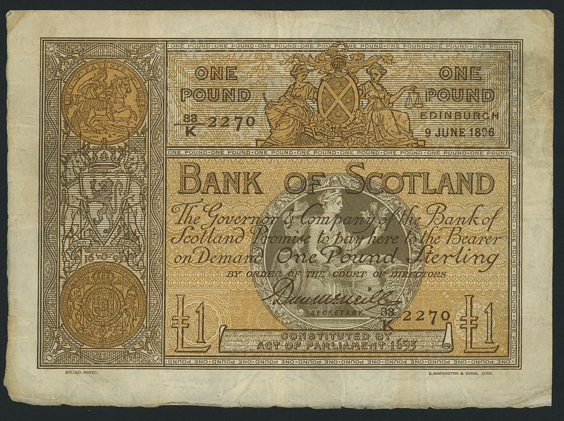 (x) Bank of Scotland, £1, Edinburgh, 9th June 1896, serial number 83/K 2270, (PMS BA 89b), good fine