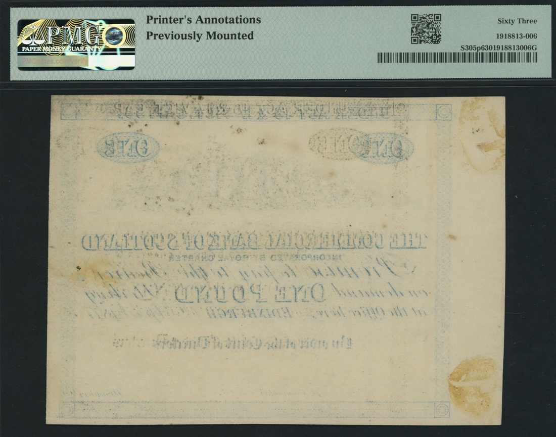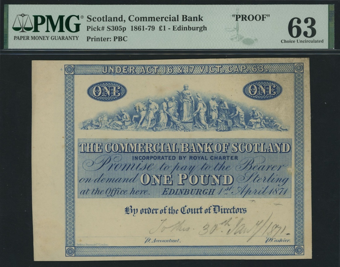 Commercial Bank of Scotland, poof £1, Edinburgh, 1st April 1871, (Pick S305p, PMS CO 36p), in PMG holder 63 Choice Uncirculated, printer's annotations, previously mounted