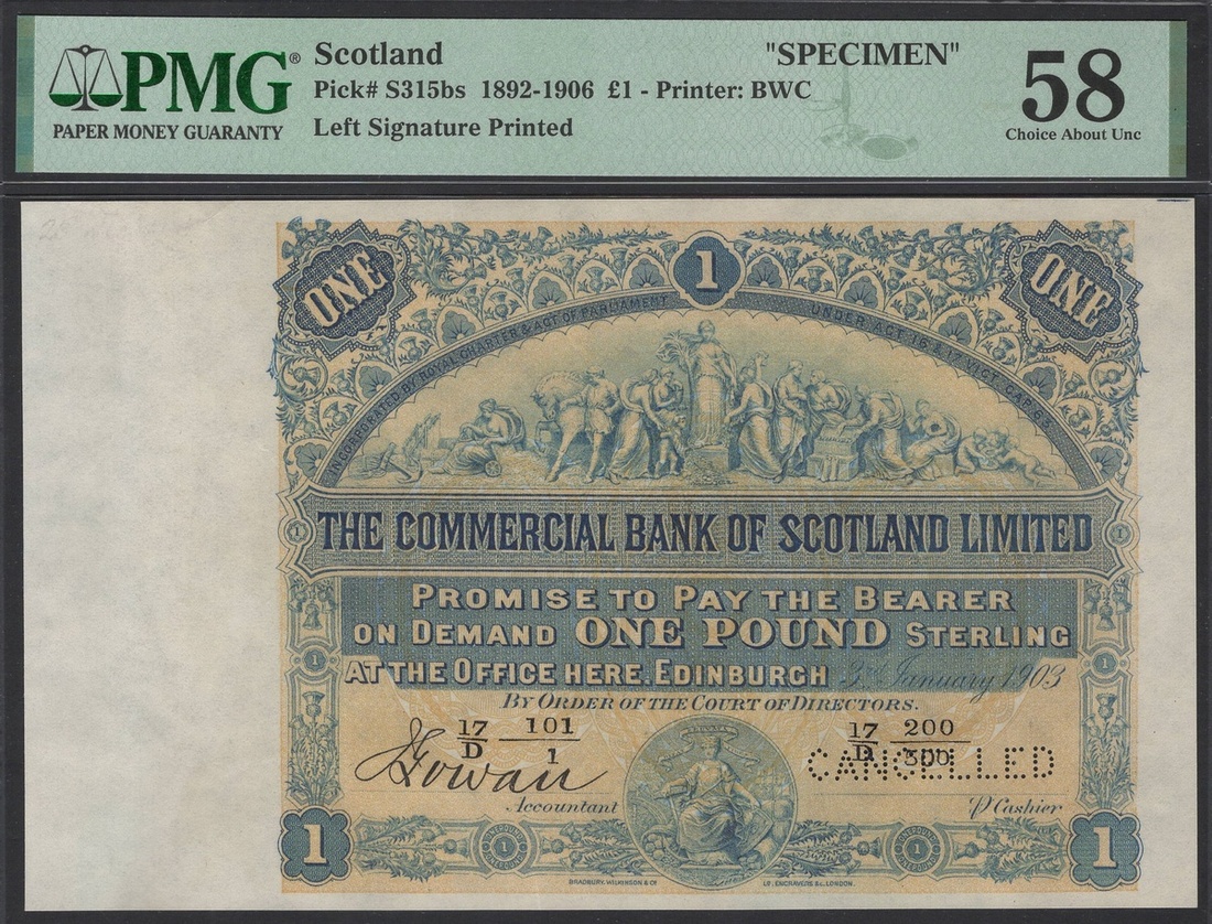 (x) The Commercial Bank of Scotland Limited, Scotland, specimen £1, 3rd January 1903, (PMS CO48c, Pick S315bs, BNB 850 for the type), in PMG holder 58 Choice About Uncirculated, only 3 notes in higher grade on PMG Census