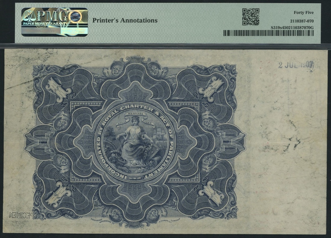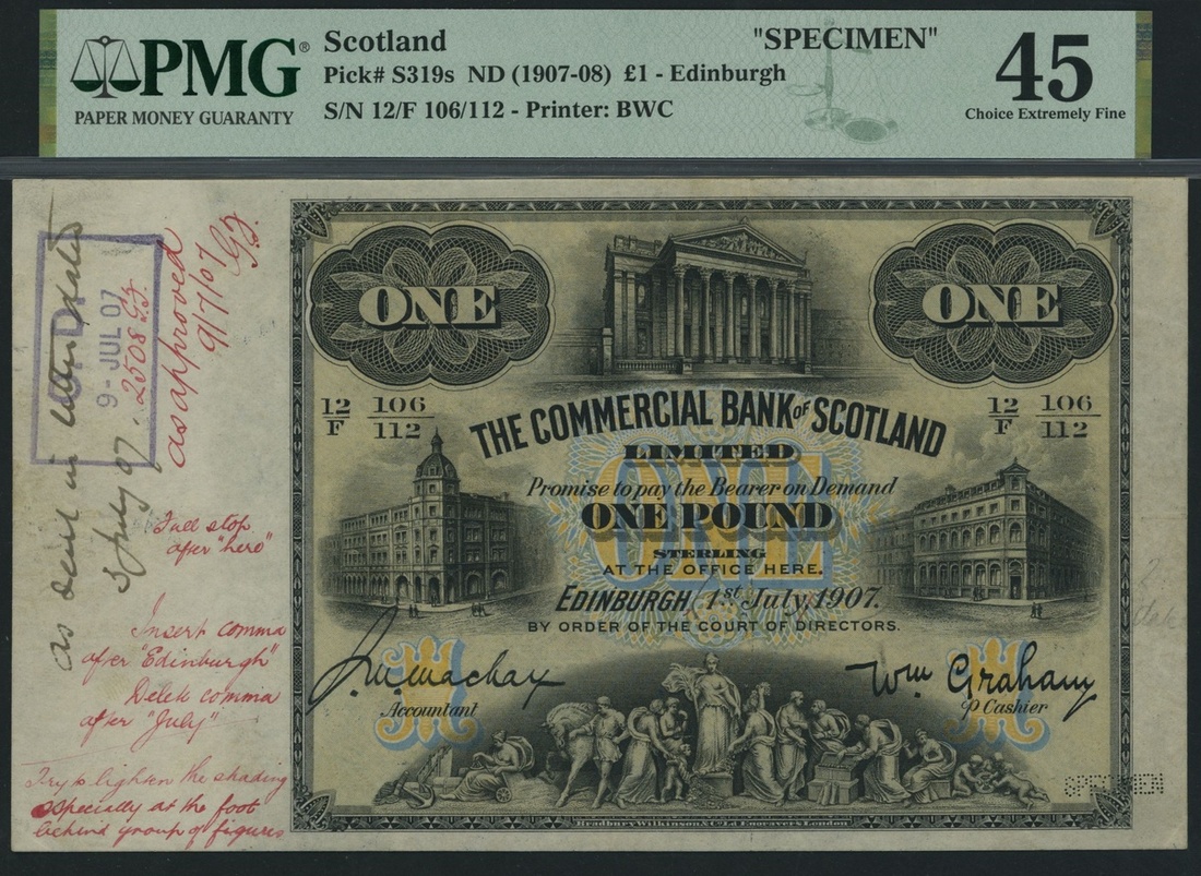 (x) The Commercial Bank of Scotland Limited, Scotland, specimen £1, Edinburgh, 1st July 1907, serial number 12/F 106/112, (PMS CO52a, Pick S319s, BNB 854 for the type), in PMG holder 45 Choice Extremely Fine, printer's annotations, only 1 note in higher grade on PMG Census