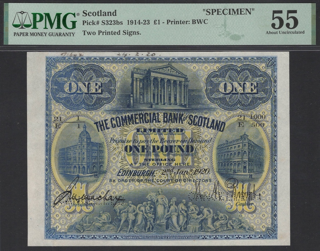 (x) The Commercial Bank of Scotland Limited, Scotland, specimen £1, Edinburgh, 2nd Jan 1920, serial number range, (PMS CO56g, Pick S323bs, BNB 858 for the type), in PMG holder 55 About Uncirculated, printer's annotations, only 1 note in higher grade on PMG Census