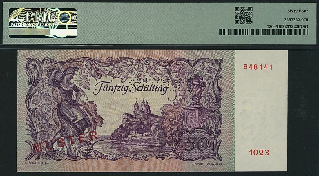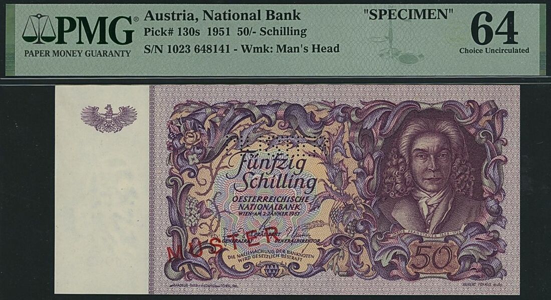 National Bank, Austria, specimen 50 Schilling, 2nd January 1951, serial number 1023 648141, (Pick 130s, BNB 234), in PMG holder 64 Choice Uncirculated, only one note in a higher grade on PMG Census
