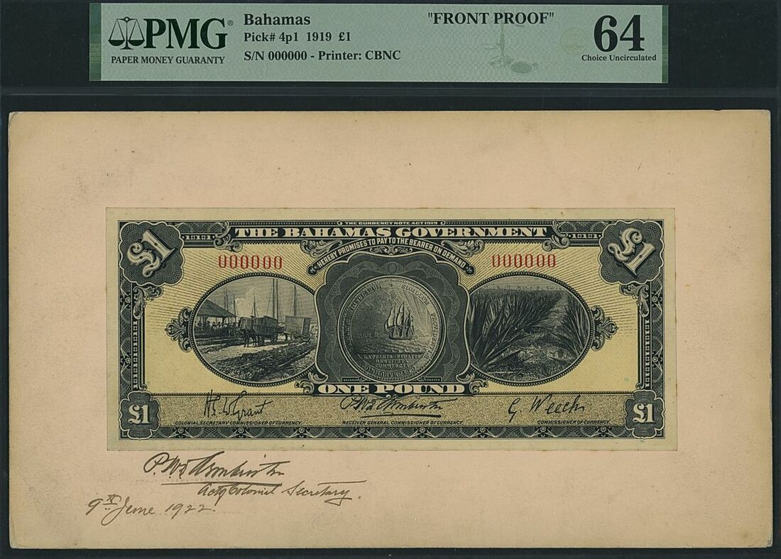 The Bahamas Government, [TOP POP] Front Proof, £1, 1919, serial number 000000, (Pick 4p1), in PMG holder 64 Choice Uncirculated