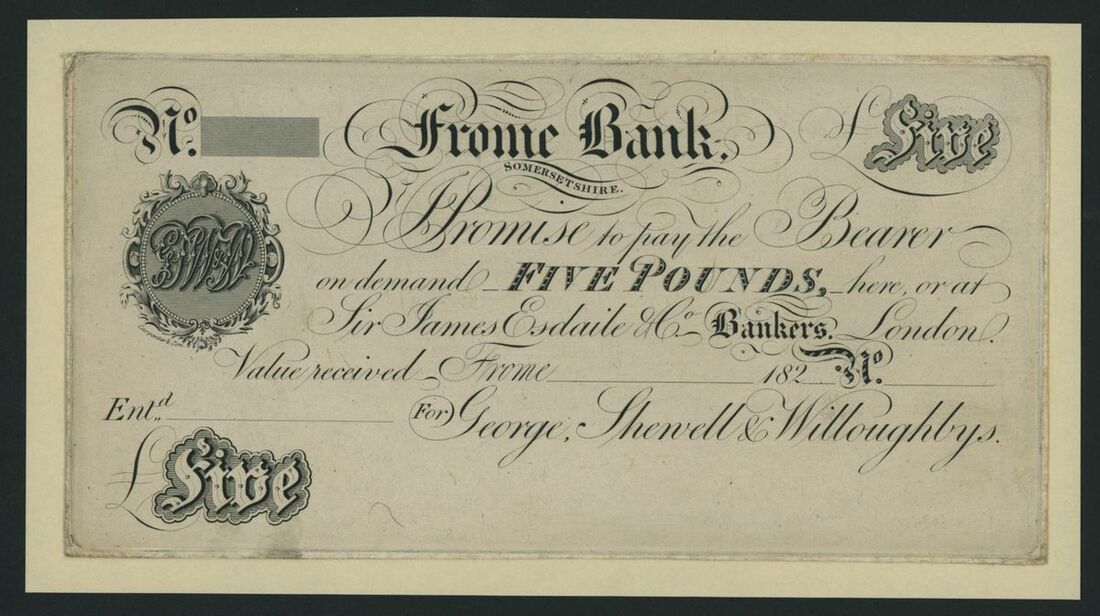 Frome Bank, proof £5, Somersetshire, dated 182-, George, Shewell & Willoughbys are mentioned in Outing 802 as agents associated with Frome without a trading name, uniface,