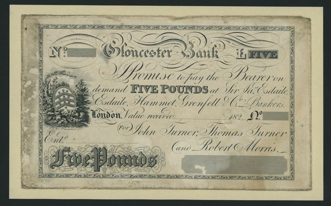 Gloucester Bank, proof £5, dated 182-, Sir James Esdaile, Esdaile, Hammet, Grenfell & Co. are mentioned in Outing 2718, uniface,