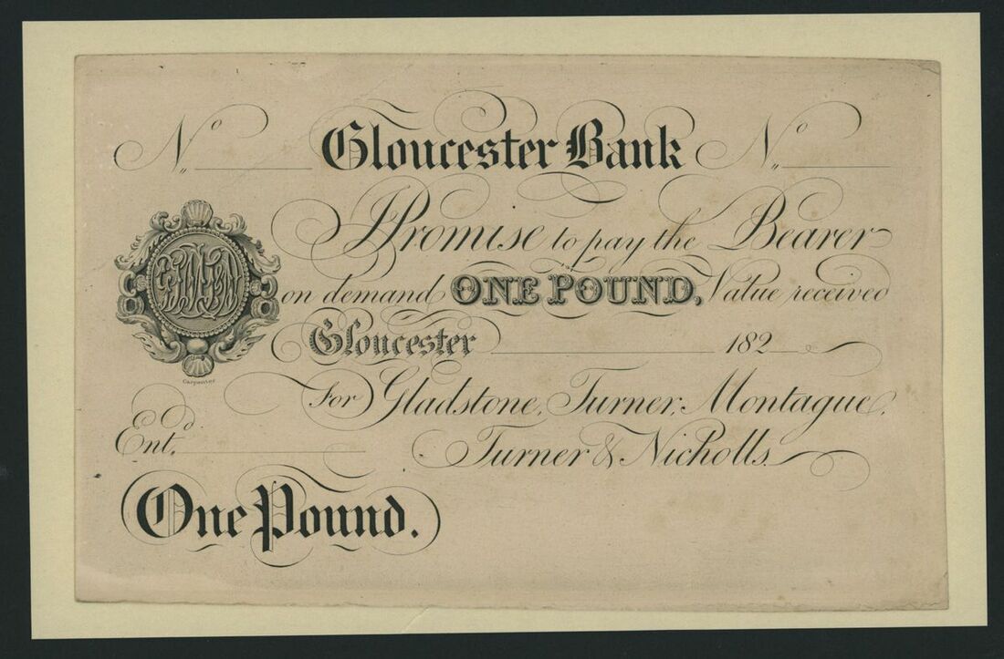 Gloucester Bank, proof £1, Gloucester, dated 182-, Gloucester Bank is Outing 824 however Gladstone, Turner, Montague, Turner & Nicholls are listed in Outing 826 with no trading name, uniface,