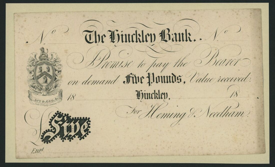 Hinckley Bank, proof £5, Hinckley, dated 18--, uniface,