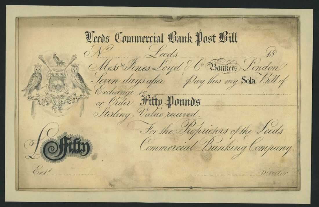 Leeds Commercial Bank Post Bill, hand drawn proof £50, dated 18--, uniface,