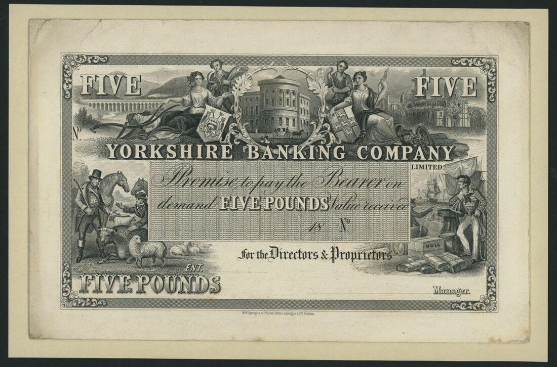 Yorkshire Banking Company Limited, proof £5, no branch named, dated 18--, without underprint, uniface,
