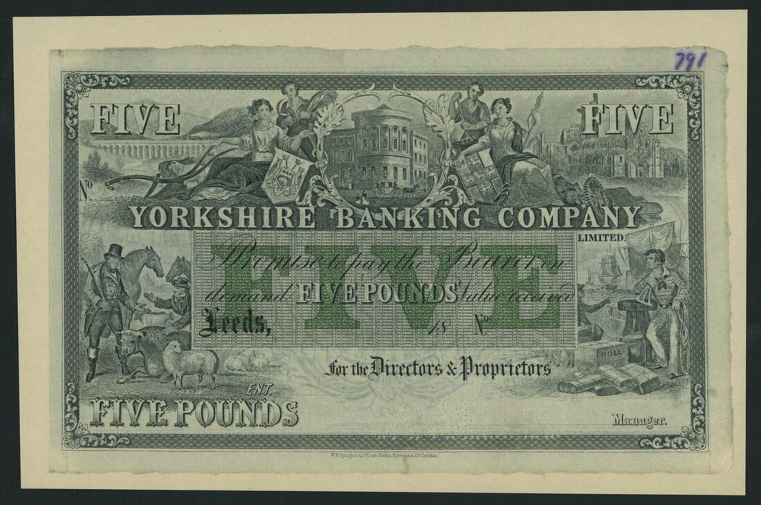 Yorkshire Banking Company Limited, proof £5, Leeds, dated 18--, perforated 'CANCELLED', with underprint, the Leeds branch is the Head Office of the Yorkshire Banking Company Limited, obverse and reverse designs,