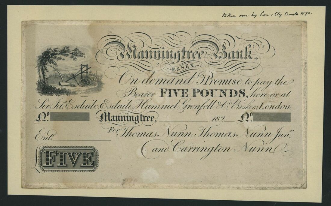 Manningtree Bank, proof £5, Manningtree, dated 182-, Manningtree Bank, Essex, not listed in Outing. However, Thomas Nunn, Thomas Nunn Junior and Carrington Nunn are mentioned in association with Manningtree & Colchester Bank, circa. 1829, however Outing states these are 'unseen'. Sir James Esdaile, Hammet, Grenfell & Co. are mentioned in Outing 2718, uniface,