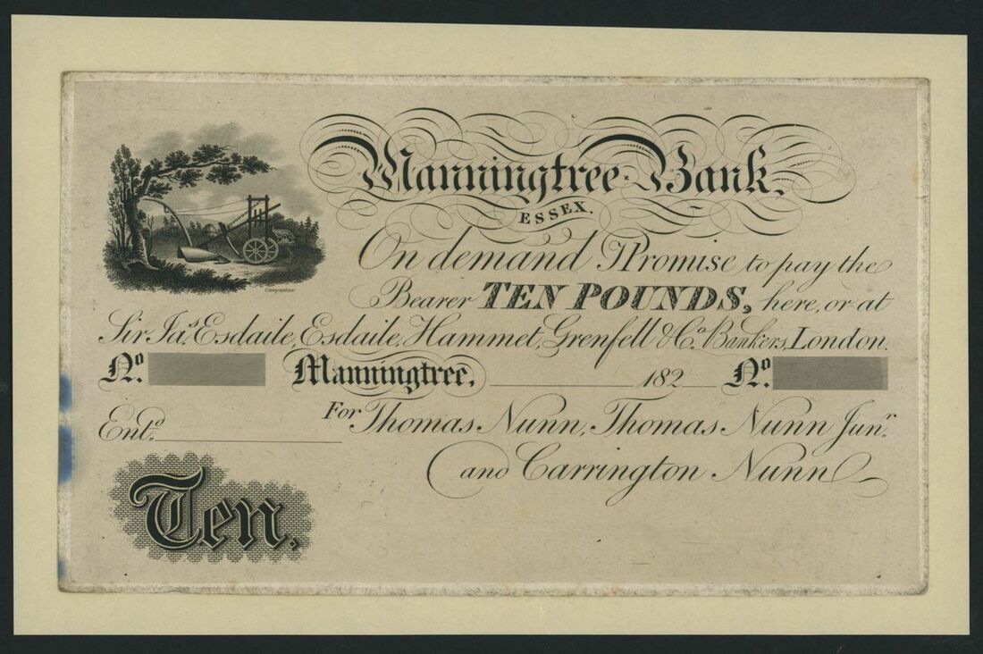 Manningtree Bank, proof £10, Manningtree, dated 182-, Manningtree Bank, Essex, not listed in Outing. However, Thomas Nunn, Thomas Nunn Junior and Carrington Nunn are mentioned in association with Manningtree & Colchester Bank, circa. 1829, however Outing states these are 'unseen'. Sir James Esdaile, Hammet, Grenfell & Co. are mentioned in Outing 2718, uniface,