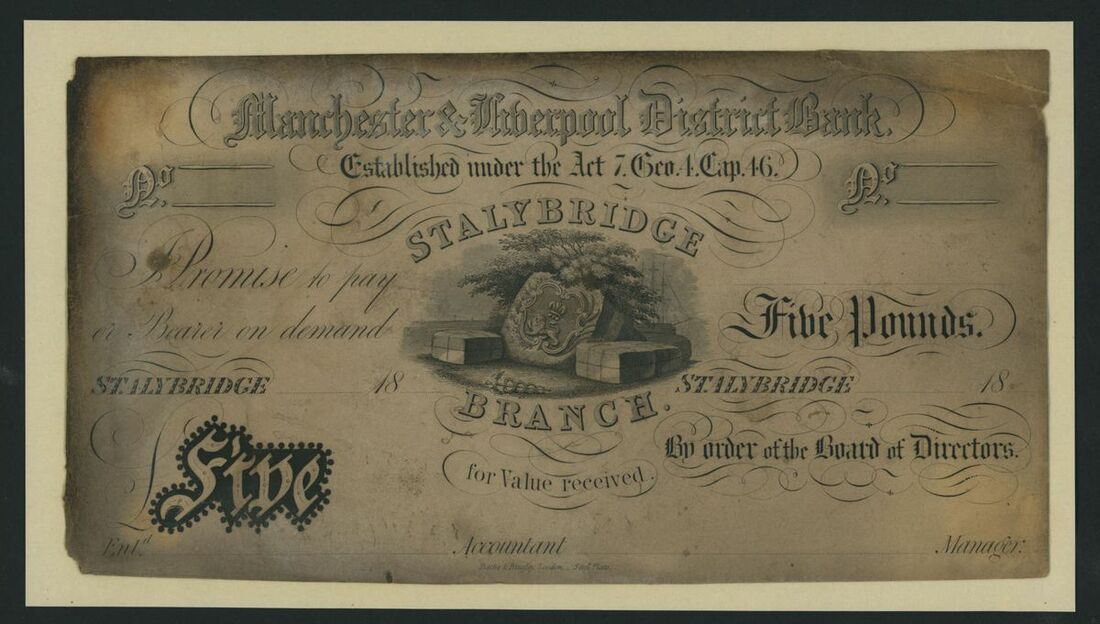 Manchester & Liverpool District Bank, proof £5, Stalybridge, dated 18--, Manchester & Liverpool District Bank unlisted in Outing, however it is most likely associated with Manchester & Liverpool District Banking Company circa. 1829-80. However, a Stalybridge branch for Manchester & Liverpool District Banking Company is not currently listed in Outing, uniface,