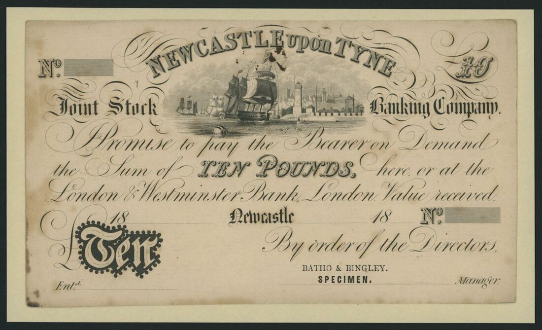 Newcastle Upon Type Joint Stock Banking Company, specimen £10, Newcastle, dated 18--, stamped 'BATHO & BINGLEY SPECIMEN', uniface,
