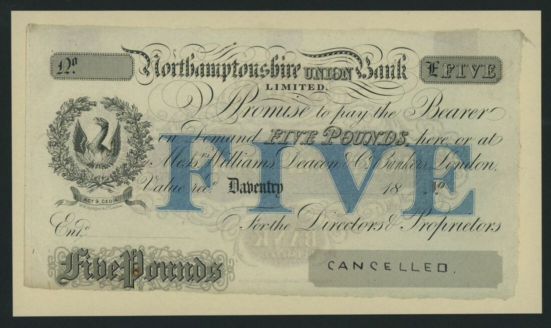Northamptonshire Union Bank Limited, proof £5, Daventry, dated 18--, unlisted under this branch, ink cancelled, Williams, Deacon, Labouchere & Co. mentioned in Outing 2693 as agents circa. 1826-28, obverse and reverse designs,